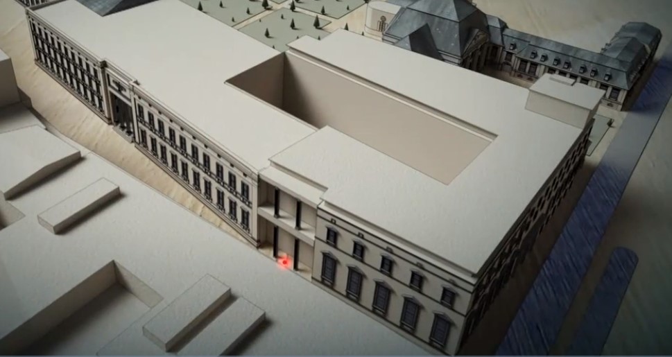 Le 25 novembre 1945, un dimanche, après que certains d'entre eux eurent été affectés à des missions, cinq Français parviendront à pénétrer dans ce qu'il restait des ruines de la nouvelle Chancellerie du Reich bâtie en 1938 (plan d'une maquette reconstituée de l'ensemble en tête d'article). Le but qu'ils se sont fixés est de pouvoir accéder à ce Führerbunker enterré sous terre afin de voir s'il n'y subsisterait pas quelque document utile qui expliquerait ce qui a pu se passer le 30 avril 1945, juste avant qu'Adolf HITLER ne se suicide en compagnie de celle qu'il venait d'épouser, sa maîtresse Eva BRAUN. Une fenêtre en mauvais état donnant sur la Vossstraße (figurant en rouge sur le plan) va le leur permettre. Mais les cinq Français sont encore loin de se douter de ce qu'ils vont découvrir une fois passé une lourde porte condamnant un escalier de vingt-six marches ! Le capitaine Michel LEROY qui encadre le groupe consignera dans quelques feuillets retrouvés en 2016 après sa mort (documents ci-dessus) ce qu'il avait pu voir dans cet endroit où subsistaient encore des relents d'humidité et une forte odeur de brûlé.